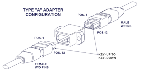 Type-A adapters shall mate two array connectors with the connector keys key-up to key-down. The complete designation for a Type-A MPO adapter is FOCIS 5 A-1-0, as defined in ANSI/TIA/EIA-604-5.